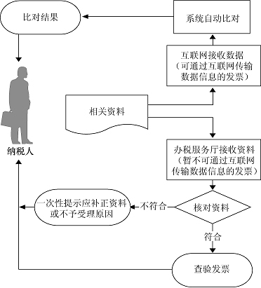 。1)辦稅服務廳接收資料,核對資料是否齊全、是否符合法定形式,符合的即時辦結;不符合的當場一次性提示應補正資料或不予受理原因。
